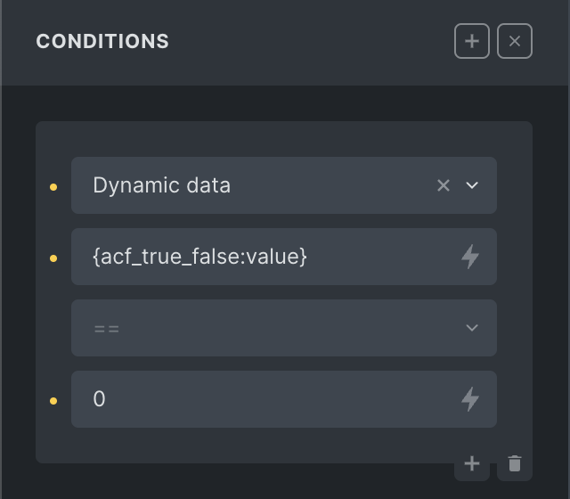 The ACF field type “True / False” is great for conditional checks inside the element conditions. By default, the localized “True / False” label is returned. When using it in your element conditions, make sure to apply the :value filter. To check for false, you can compare against == 0. Or == 1 to check for true.