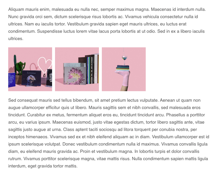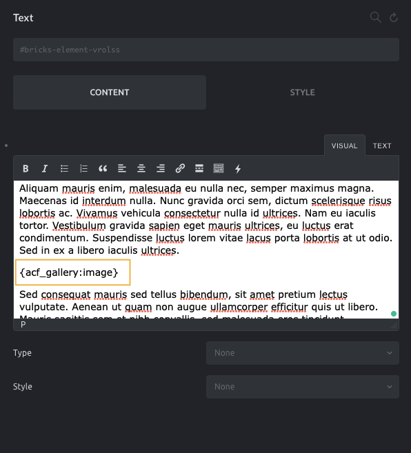 All dynamic data tags are available in all elements that support dynamic data. This means that you may insert a gallery field (like an ACF gallery field type) inside a text element and it will be rendered as a set of img tags (using the filter :image), like so: