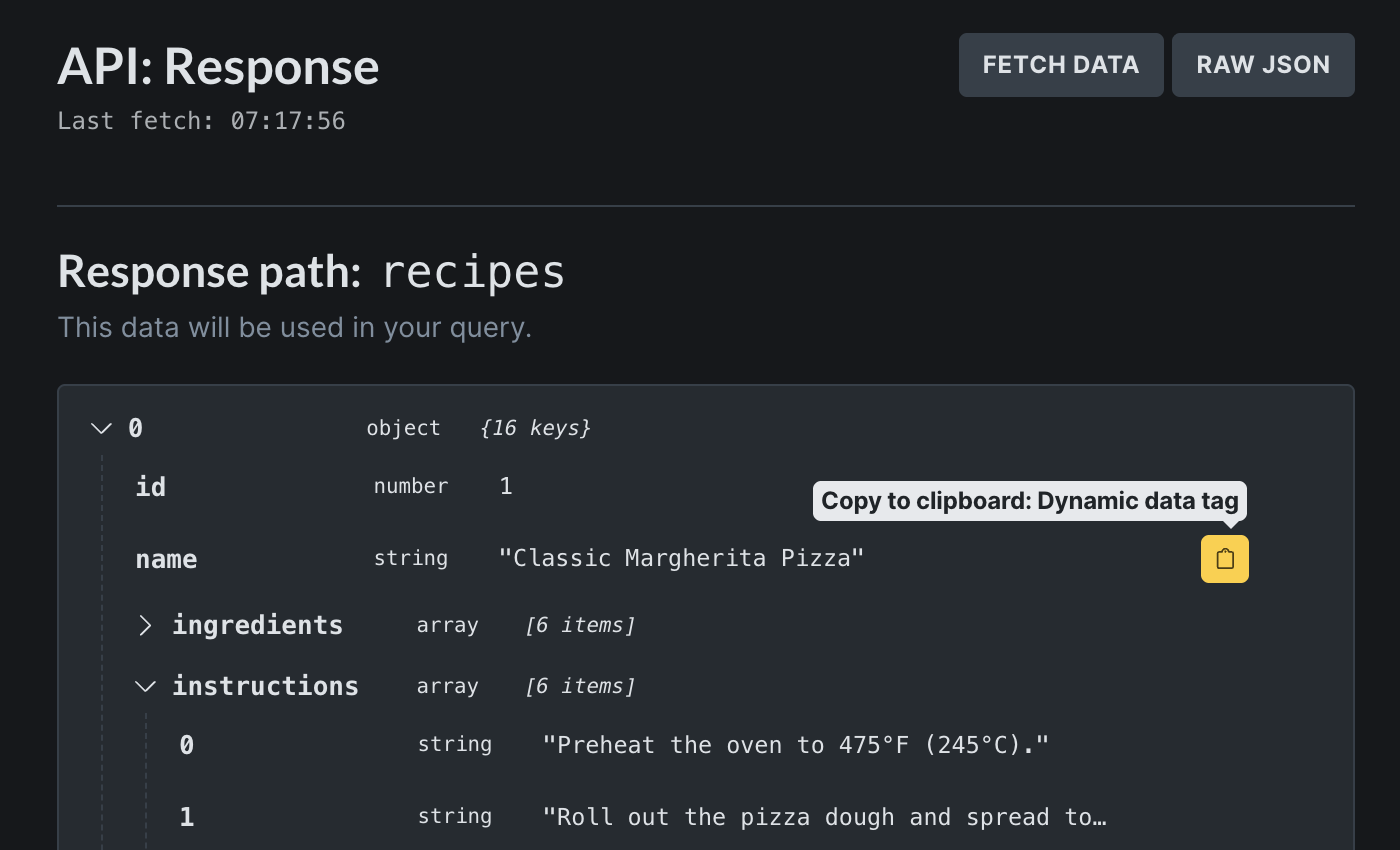 Once you have everything configured you can fetch the API response data and preview it in the column on the right-hand side. And copy or generate custom dynamic data tags to easily render the API data inside the loop.