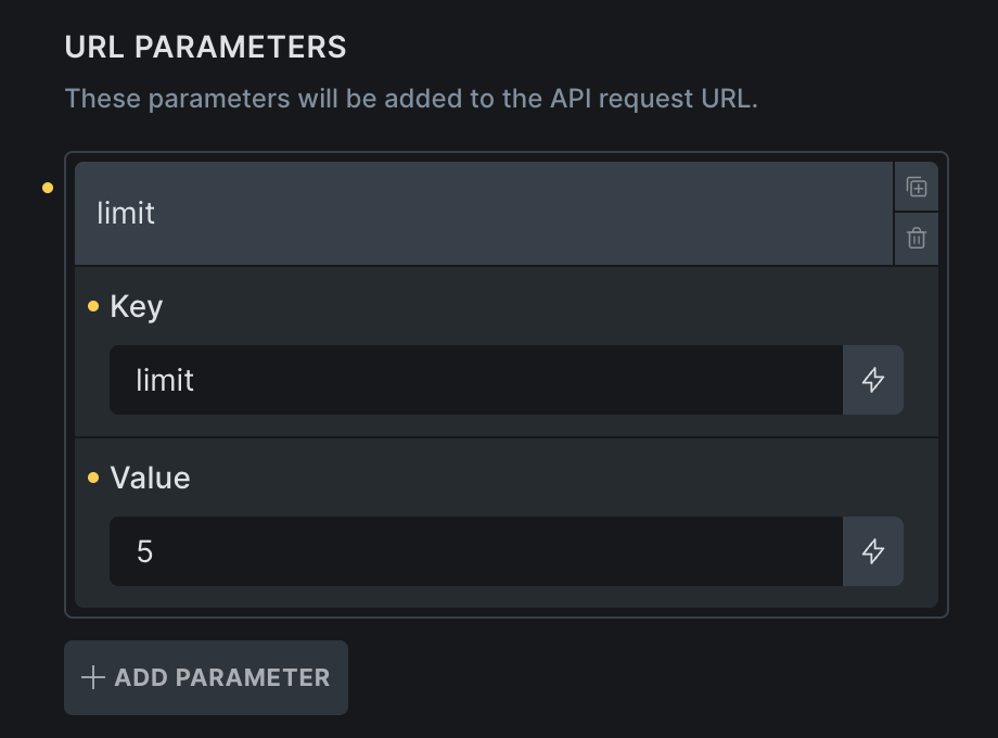 Section titled “URL Parameters”You can add key-value pairs that will be appended as query parameters to the API URL.
