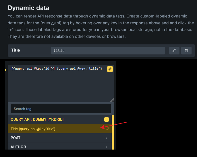 Section titled “Using the API response data in your loop”Bricks introduces a new query_api dynamic data tag to render any piece of the API response defined via the @key filter.
