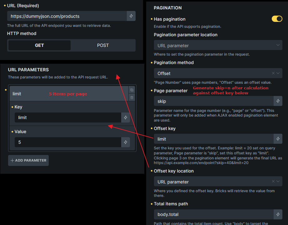 Based on the documentation, to get 3rd page data when limit (items per page) is 5, we should pass limit=5&skip=10 in the API request. In Bricks, just need to set as below image.