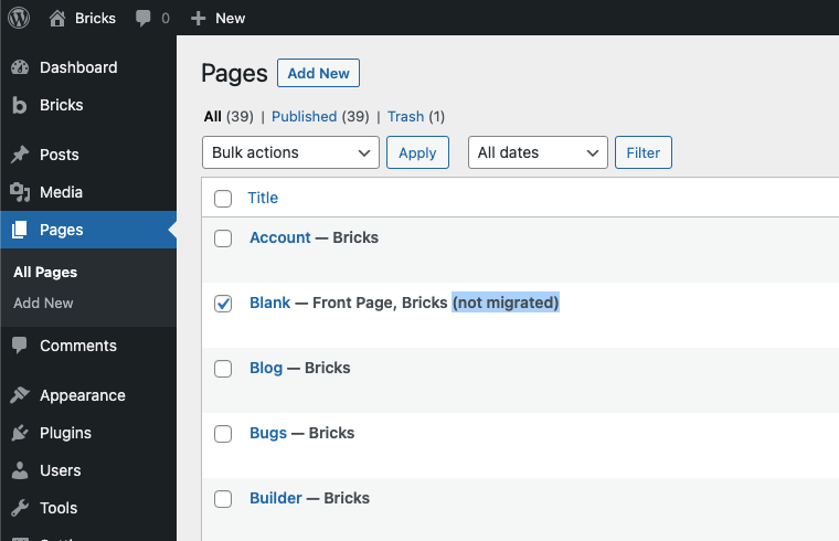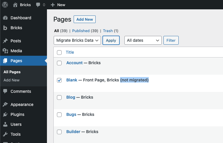 Section titled “STEP #2: Select your page and run the migrator”Now select the page you want to migrate, click on the “Bulk actions” dropdown. Select “Migrate Bricks Data” and click “Apply” to run the migrator: