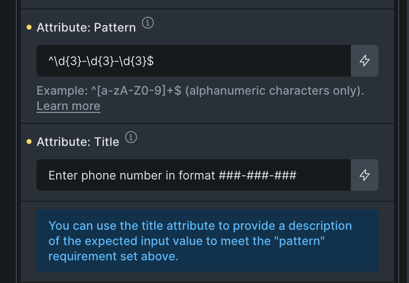 Section titled “Pattern attribute validation”With the new pattern attribute (@since 2.0.2), you can now validate form input natively before submission. Combined with the title attribute (also @since 2.0.2), you can display custom error messages directly from the browser.