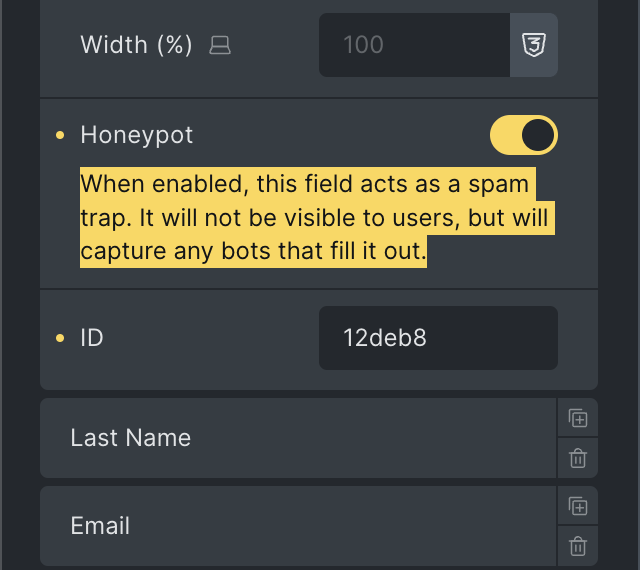 Another spam protection layer, available since Bricks 1.12.2 is the ability to turn any form field (except “Files”, “Remember me”, “HTML” and “Hidden”) into a honeypot field. This won’t affect or interrupt actual website visitors, but it’ll prevent bot form submissions if they fill out any of your honeypot fields.