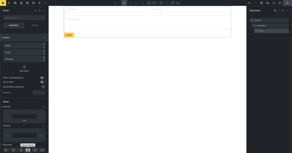 Lastly, set the “Alignment” to “space-between” to ensure our fields horizontally align with the outer edges of our form.