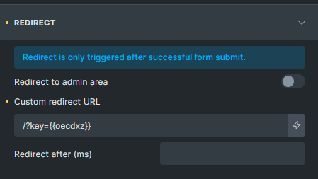 Section titled “Redirect”This form action redirects the user from the form page to a different page on your site. You may set the redirection to the admin area or to a custom URL and set the redirection to happen only after a specific period of time.