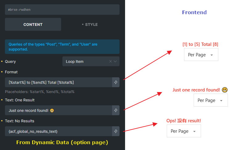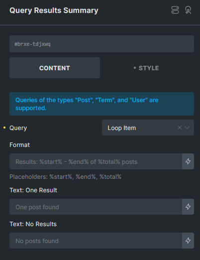 The Query Results Summary element, introduced in version 1.12.2, allows you to display a dynamic count of results within a query, helping users understand which items they are currently viewing in relation to the total number of results. This is particularly useful for search results, archive pages, and paginated lists where users navigate through multiple pages of content. It can be found in the elements panel under the “Query” category.