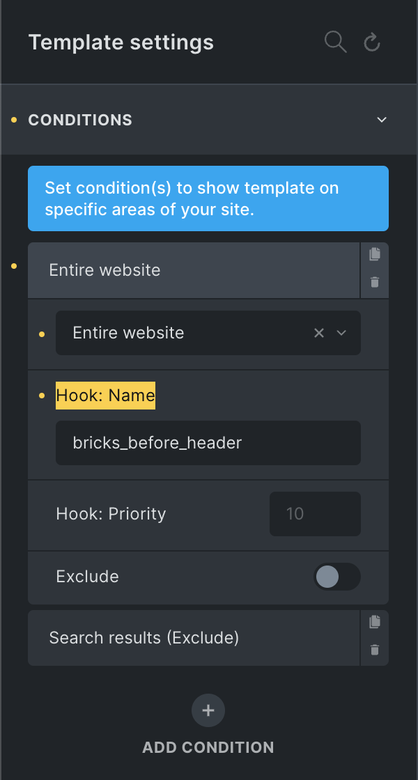 All you need to do when editing your section template is to select your template condition (i.e., the entire website) and enter the WordPress action hook name under “Hook: Name”. Your section template will now be rendered wherever this action hook is triggered.