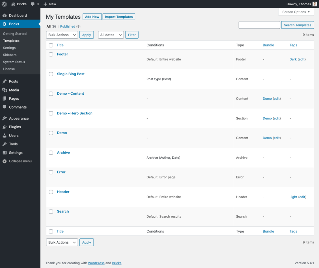 Section titled “Template Bundles & Template Tags”These two Bricks template taxonomies can be used to organize and group your templates together. They are 100% optional.