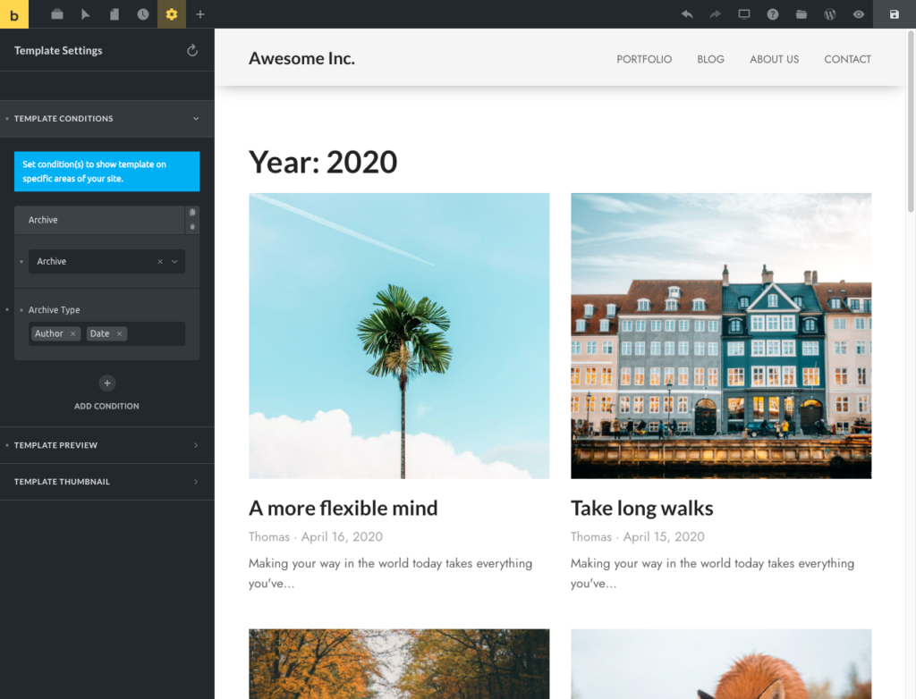 For example, an Archive template will be used on all author and date archive pages (see screenshot below). The Single Blog Post template is responsible for all your posts. Both are set as such via template conditions.