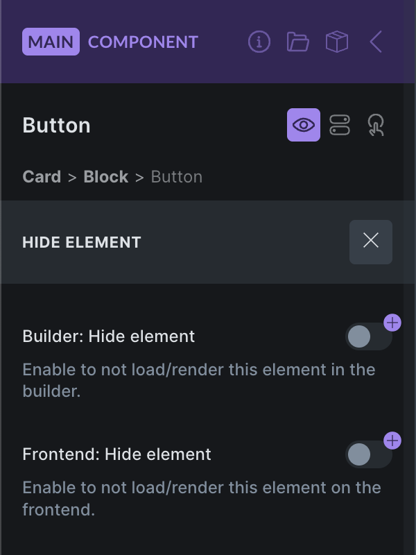 Section titled “Component variations”Starting with Bricks 2.0, you can further customize your components instance by conditionally hiding elements within a component through the Toggle property.