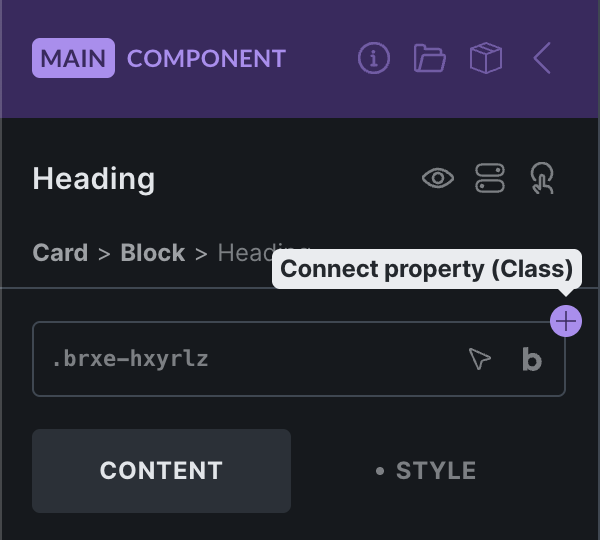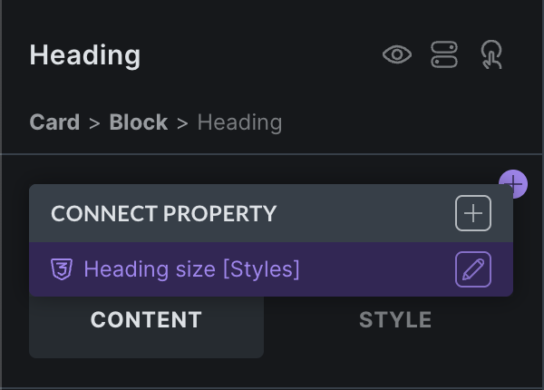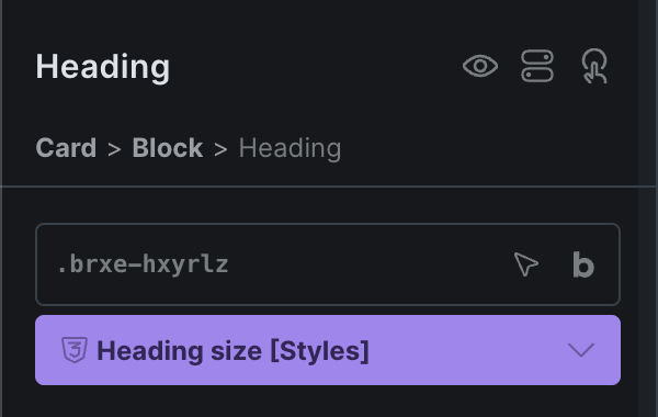 Once we have created this new “Heading size” property, we need to connect it to the global classes control of the element of our choice. For our example, we connect it to the Heading: