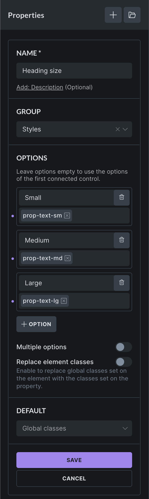 In the following example (see screenshot below) we create a global classes property with the custom options “Small”, “Medium”, “Large”. Each option is has a different global class assigned to it. You can also assign multiple classes.