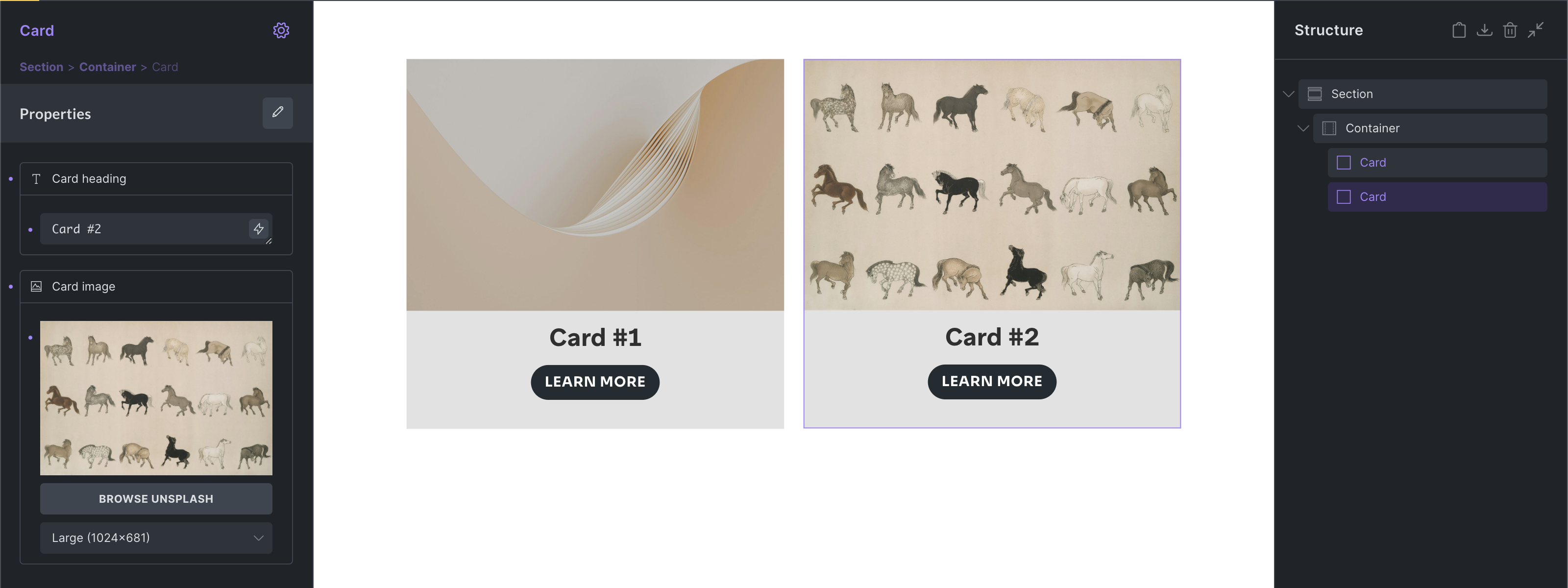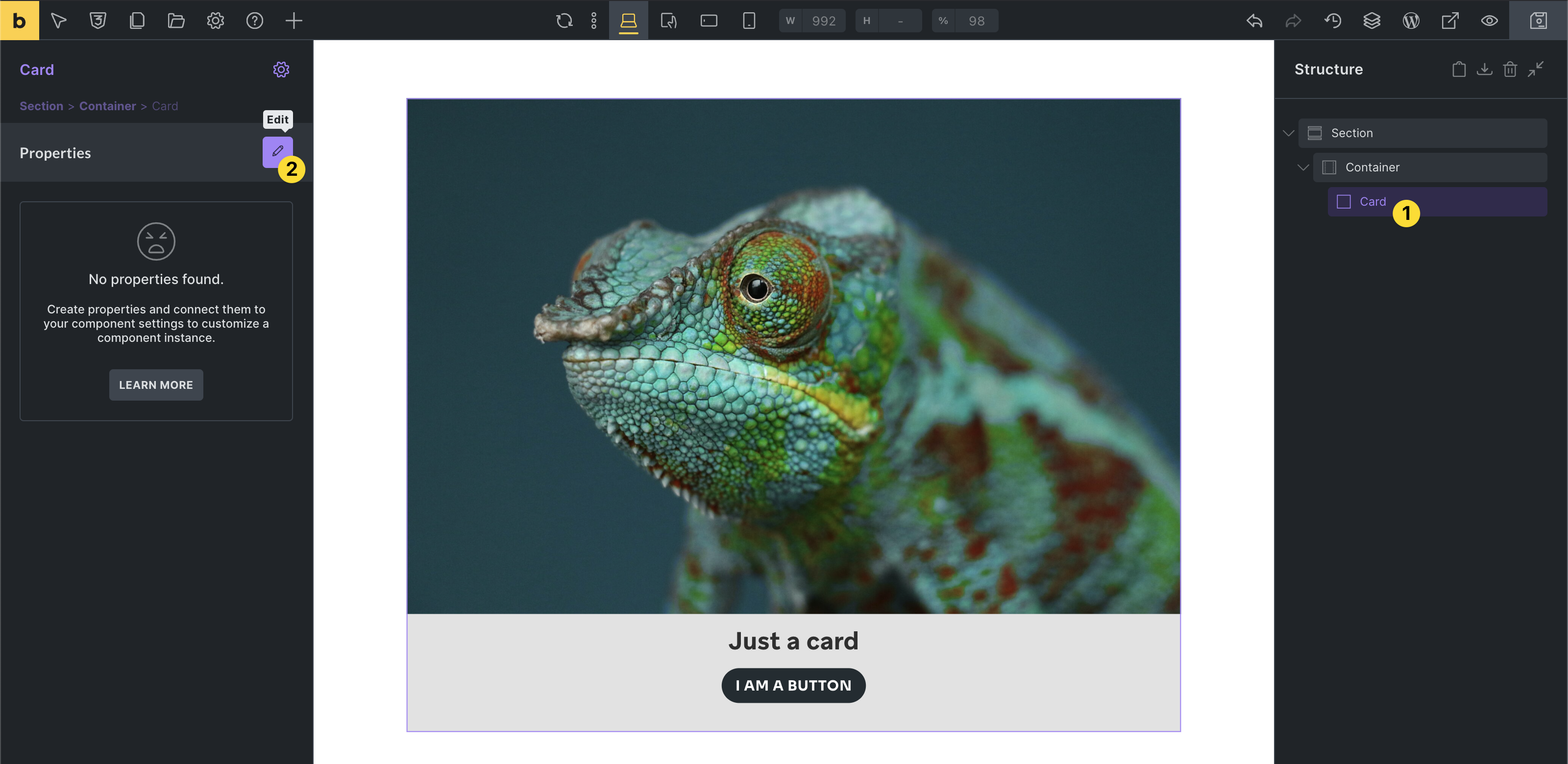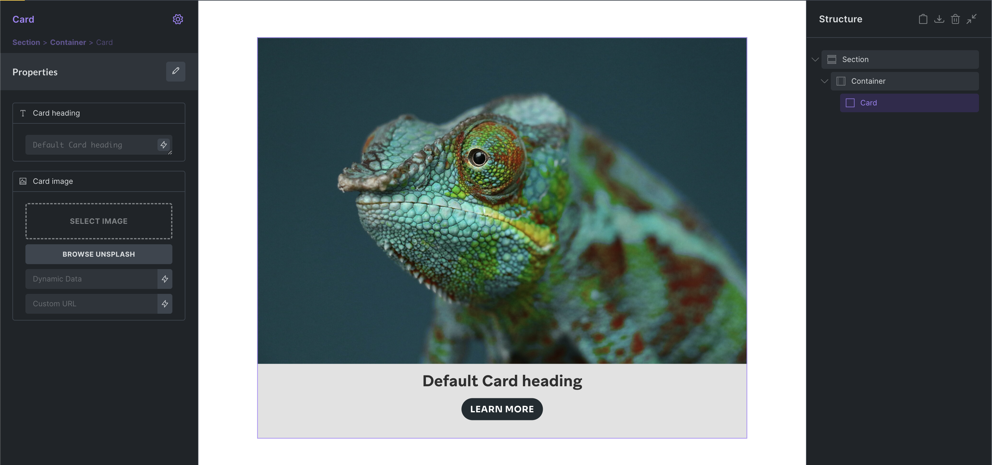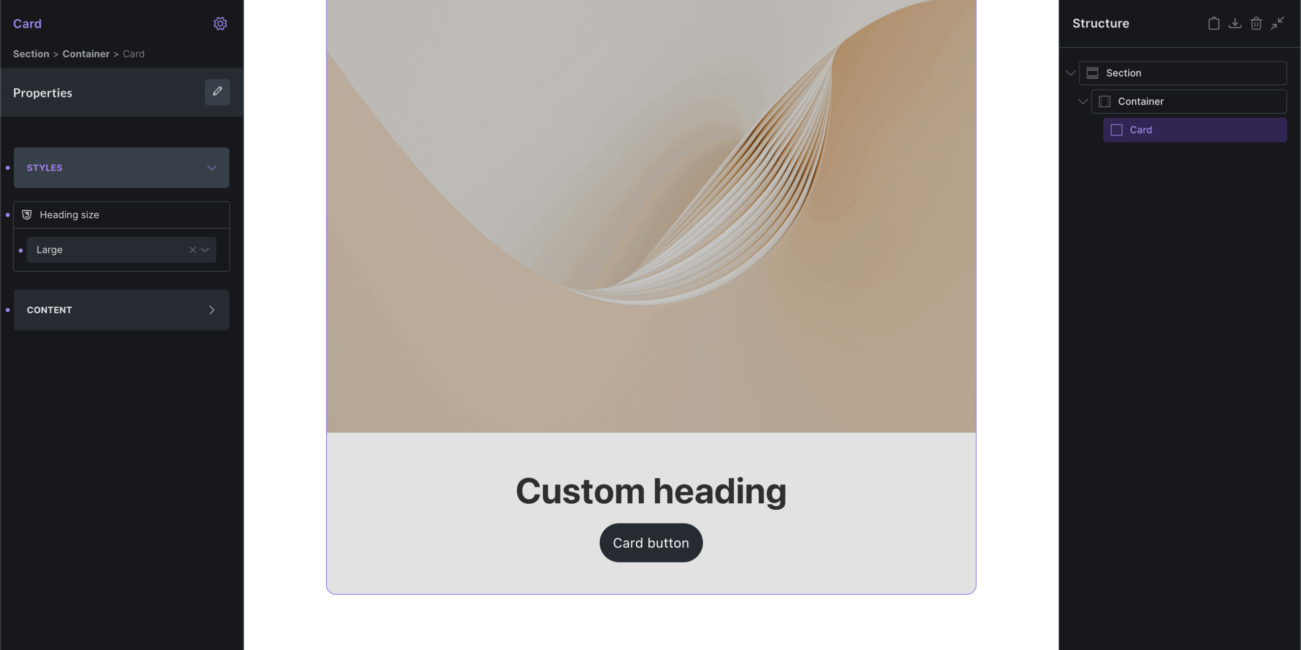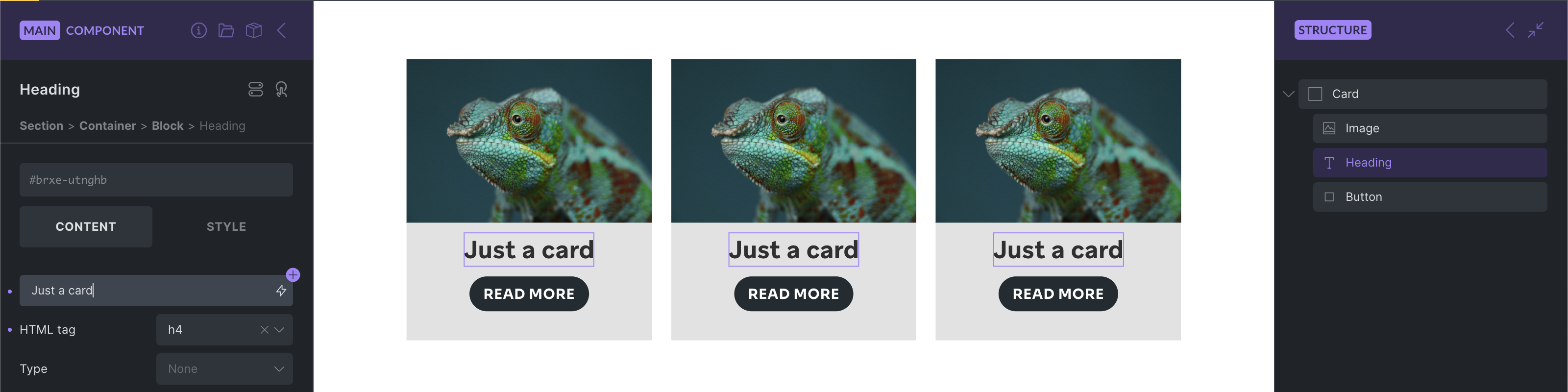 To edit the title of our Card component, select the Heading element inside our component, and change its text to “Just a card”.