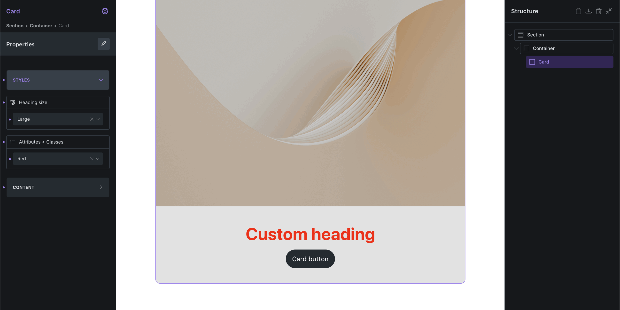 Once we created & connected this select property to the Attributes value, it’ll be available on the instance, and we can apply our local class with one click like this, which add the color-red class to our Heading element inside the component.