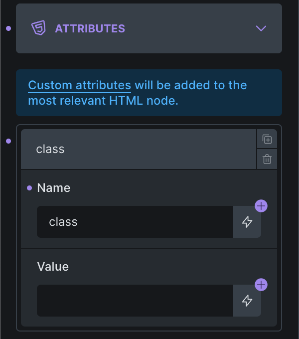 Section titled “Variation: Local classes”If you aren’t working with global classes you can utilize the “Select” property type to define custom options that your users can choose from, which then apply the class names through the “Attributes” control to an element of your component.
