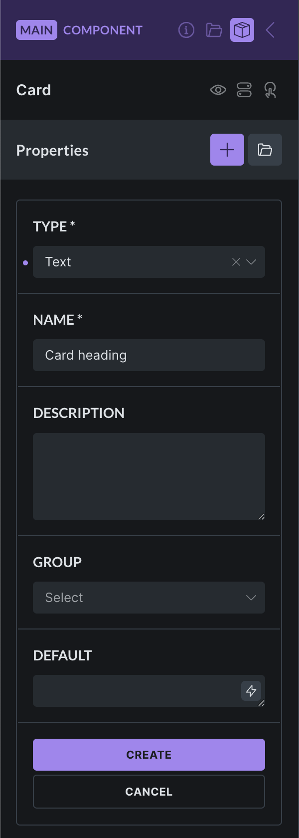 Section titled “1) Creating a property”To access the properties panel, select any instance of the component you want to edit.