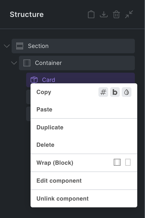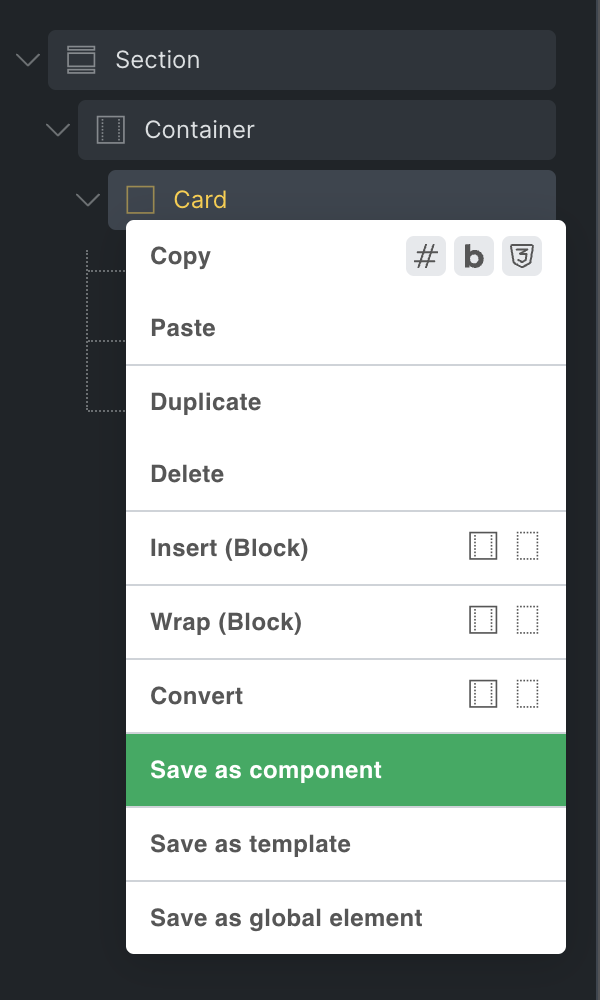 Section titled “How to create a component”Create a component from any element, except Template & Filter elements, by right-clicking on the element, and select the Save as component action.