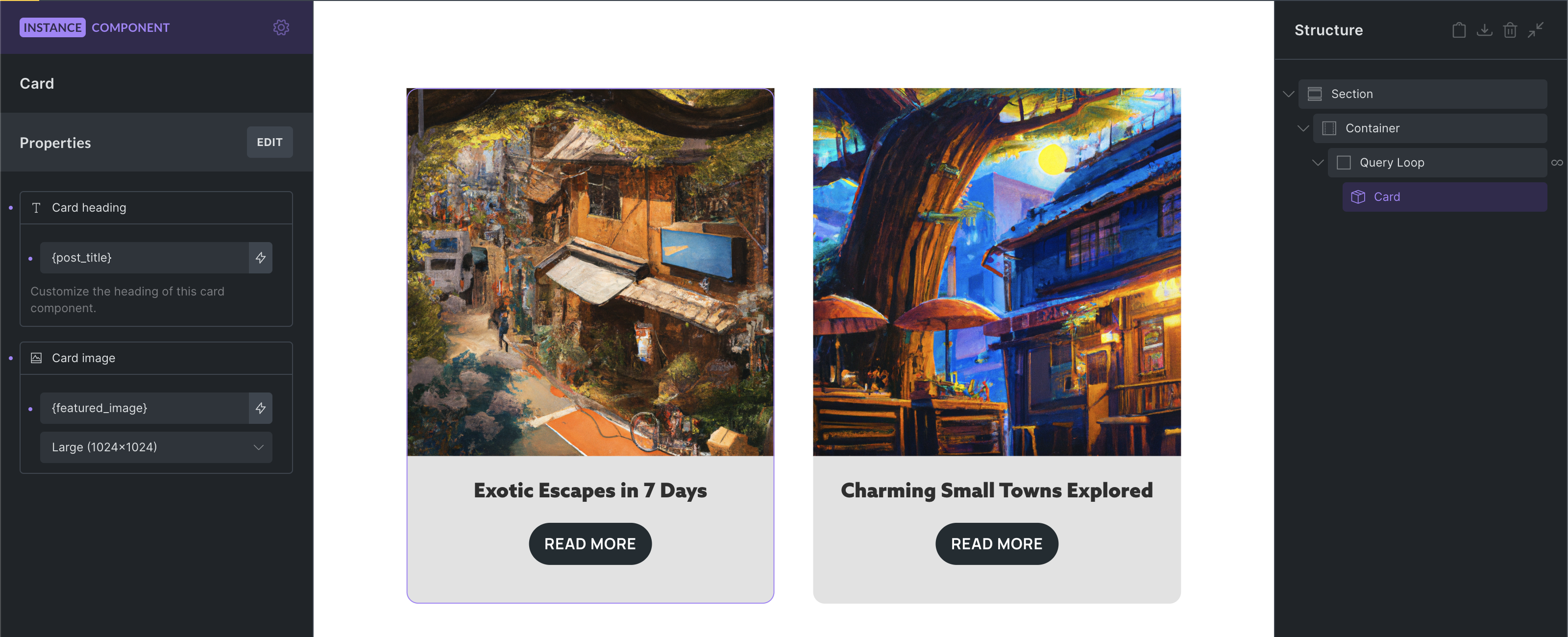 In the following screenshot we use our Card component inside a loop. The Card title uses the post_title dynamic data tag and the Card image uses the featured_image tag to render the post title & featured image of the loop results.