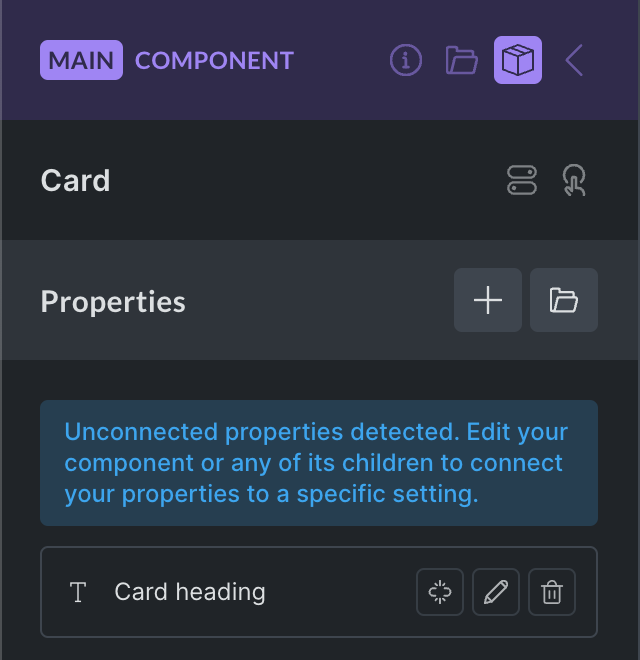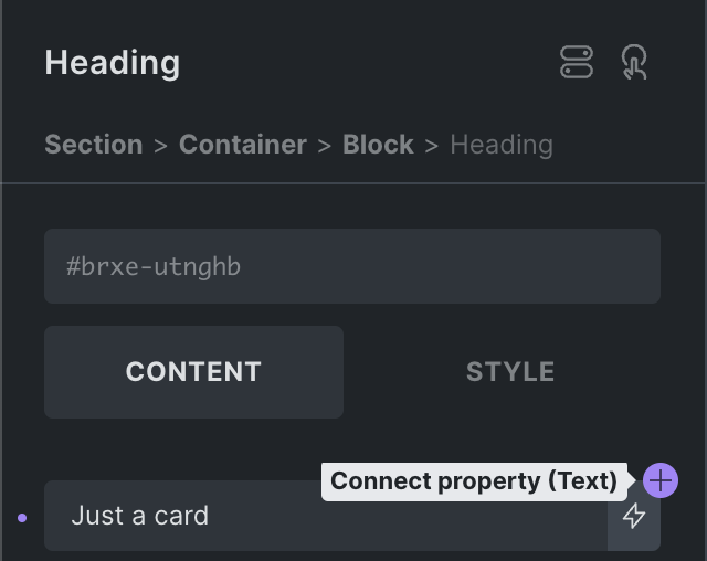 Lets connect our “Card heading” text property to the “Heading” element of our card component.