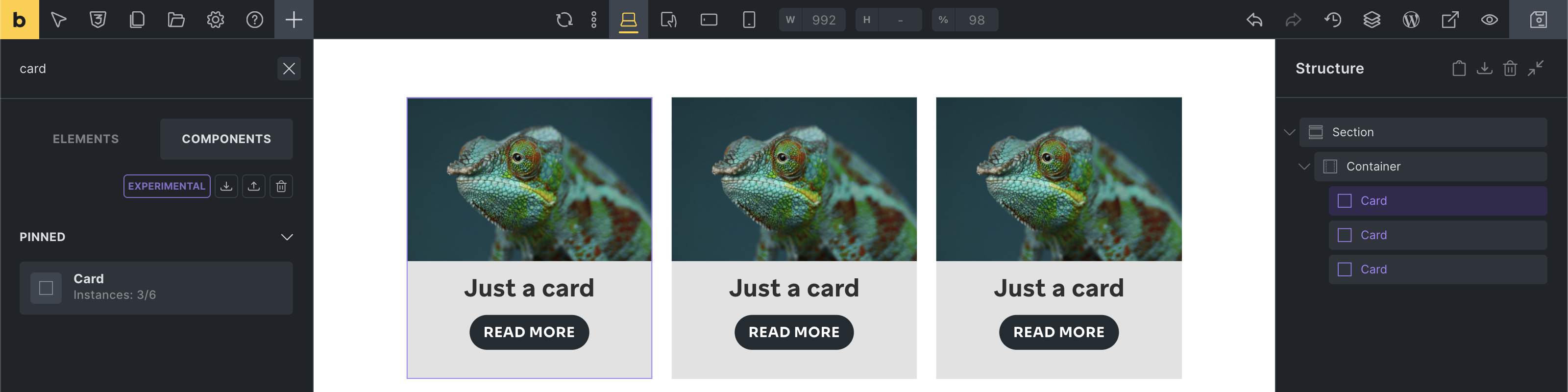 Below the name of the component is the instance count. For our “Card” component it says “Instances: 3/6”. The first number (3) is the instance count of the page you are currently editing, and the second number (6) is the total instance count global/site-wide.