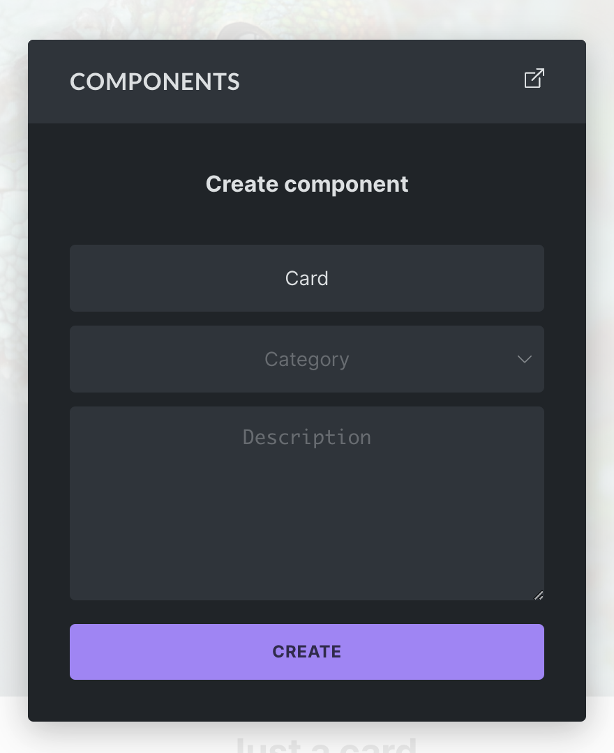 In the popup that appears, enter a name (required), category (optional), and description (optional) for your new component. Once done, click Create to finish creating your component.