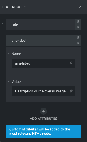 Let’s say you want to add an ARIA role and label to a container that contains multiple images that should be considered as a single image. You’d add the following two attributes when editing your container: