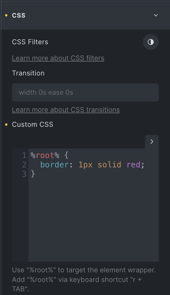 Use the **%root%** placeholder to target the element or global class you are currently editing. Bricks automatically converts this****%root%**** placeholder to your element ID or global class.