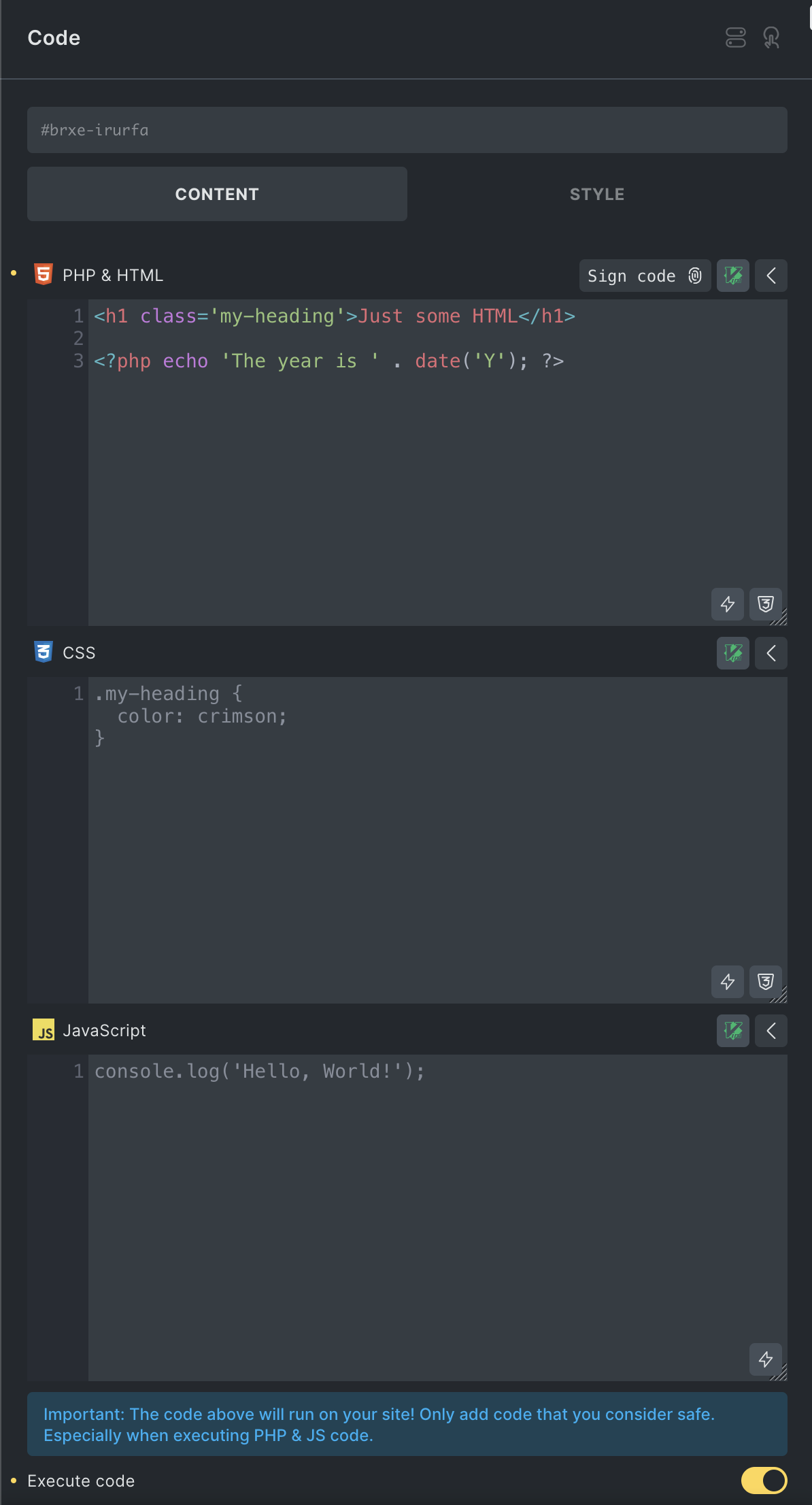 Section titled “Code Element (PHP, HTML, CSS, JS)”The “Code” element allows you to execute your own code (PHP, HTML, CSS & JS) anywhere on any page.
