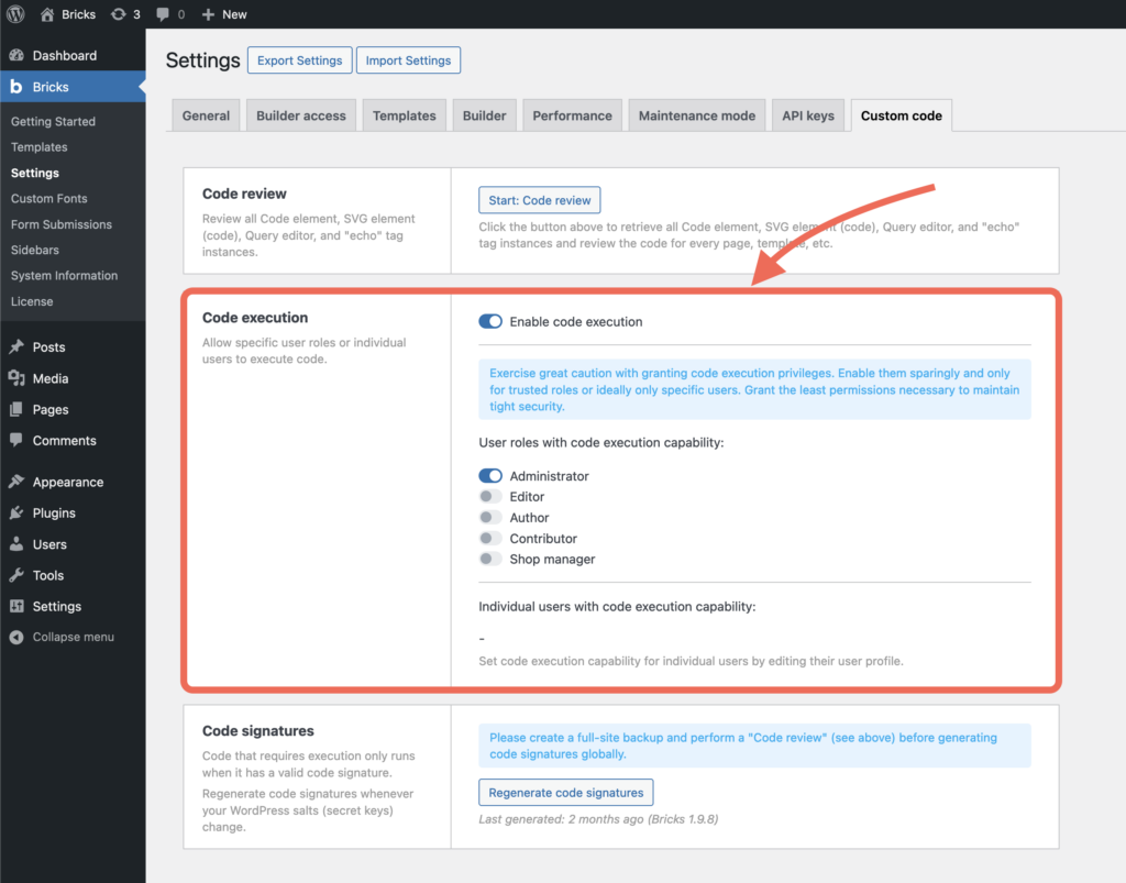 In order to execute your code, you need to first enable “Code Execution” for the appropriate user role or user in your WordPress dashboard under “Bricks - Settings - Custom code” (see the screenshot below).