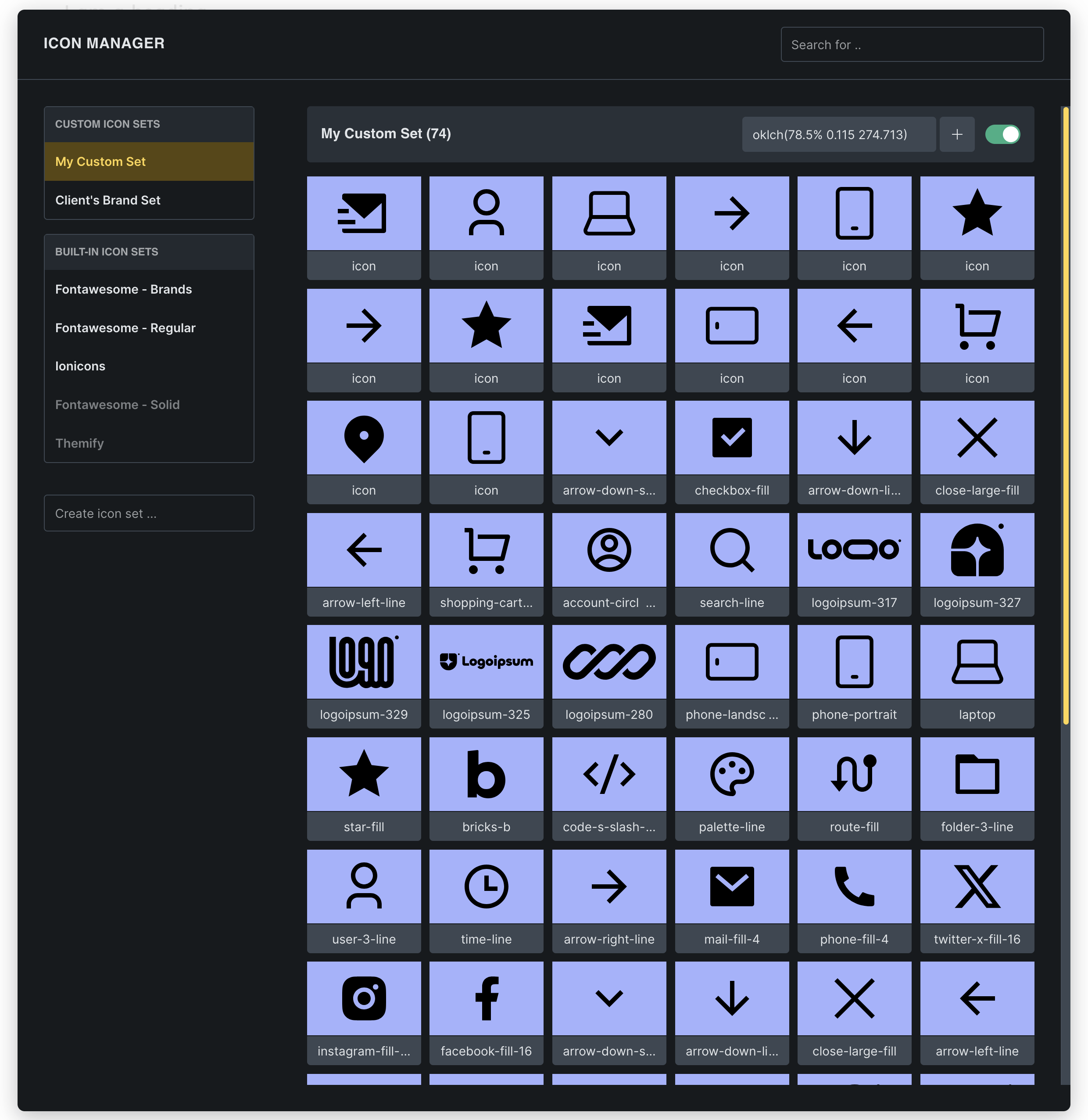 This opens a popup where you can manage both built-in and custom icon sets.