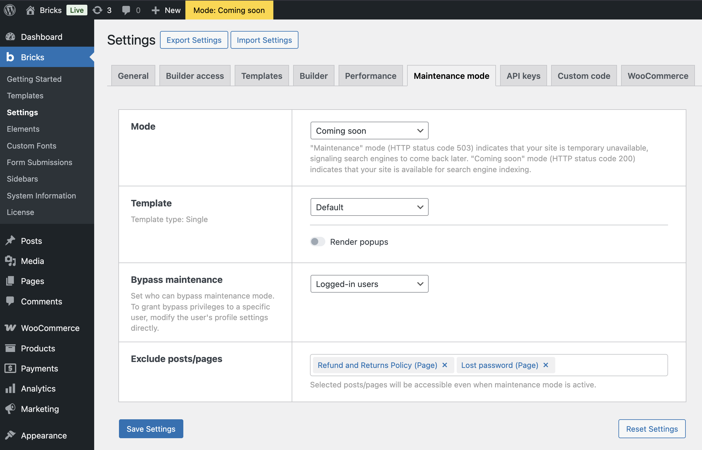 - Render popups (optional): Enable this setting if you want Bricks popups to be rendered on the maintenance or coming soon template. This is disabled by default.