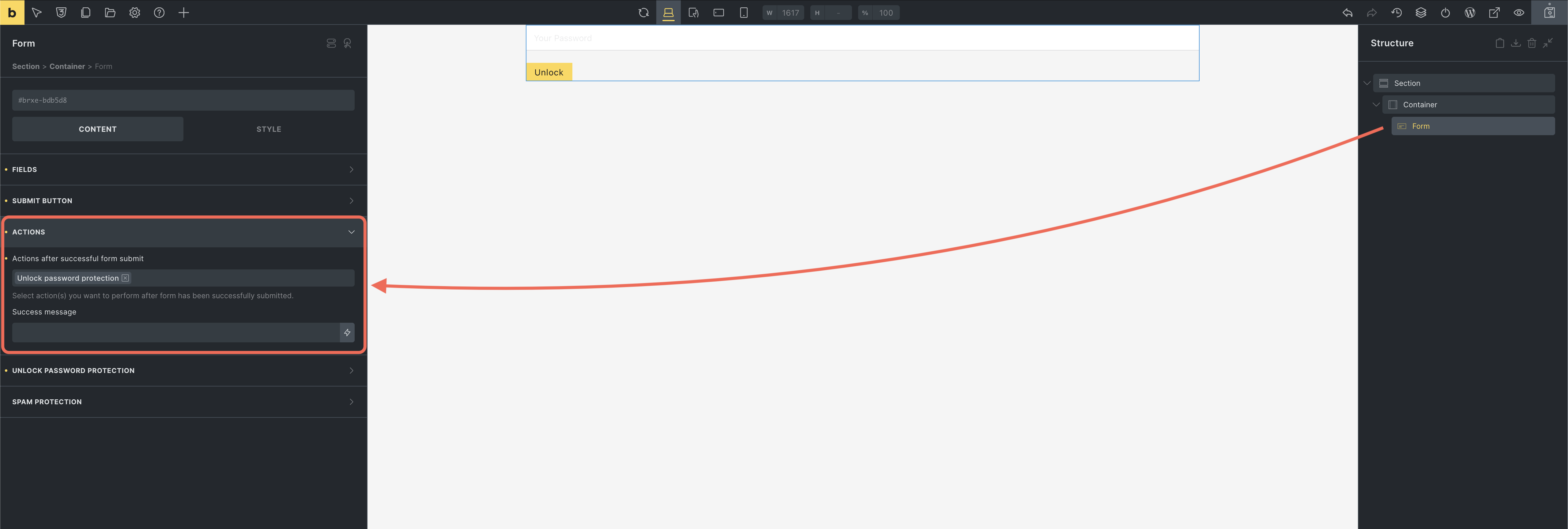 Add an Unlock password protection form action. This action will allow users to unlock the protected content by entering the correct password.