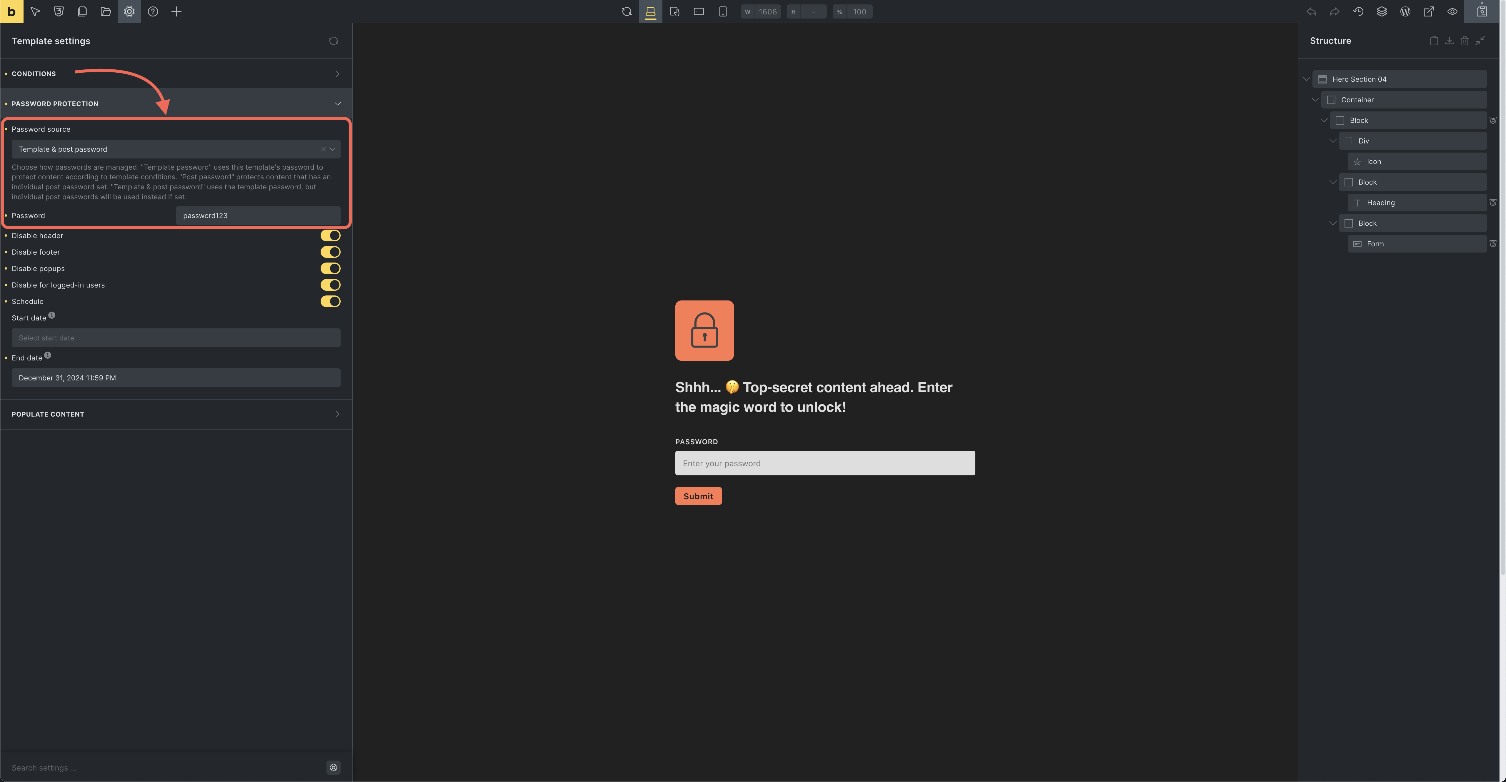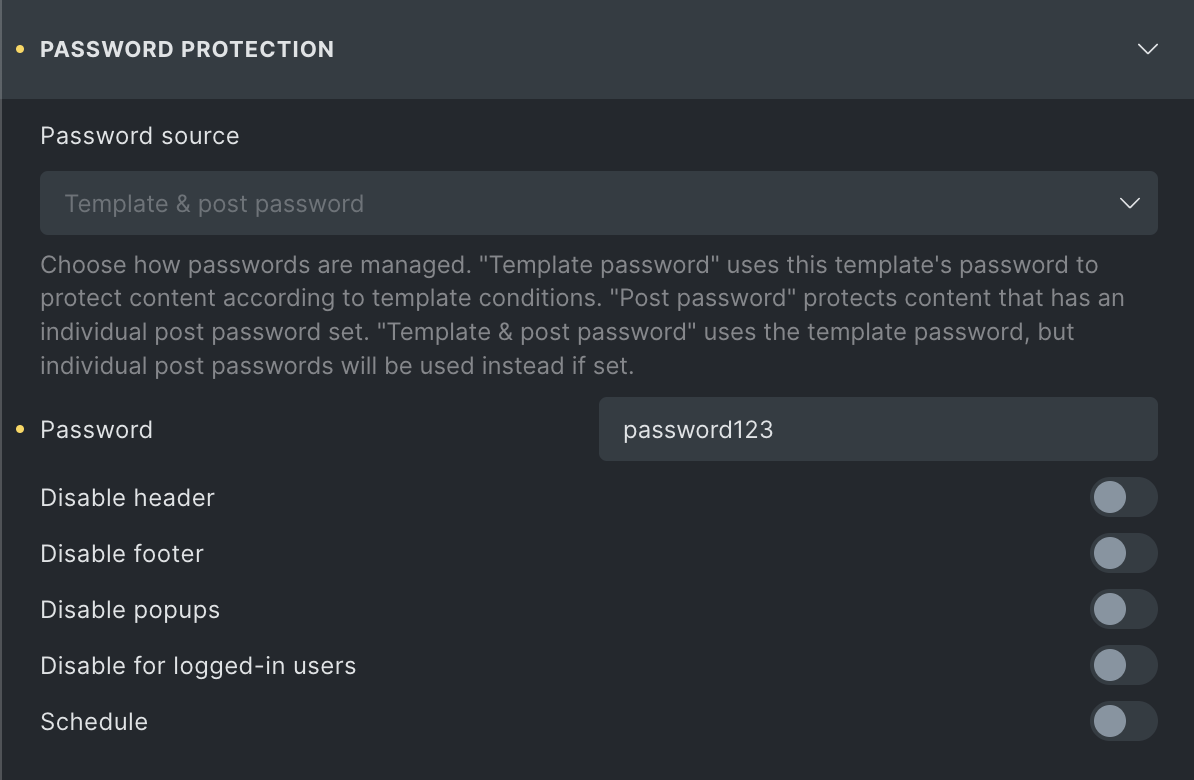 Section titled “Template & post password”The Template & post password option uses the template password by default. However, if an individual post password is set, it will take precedence.