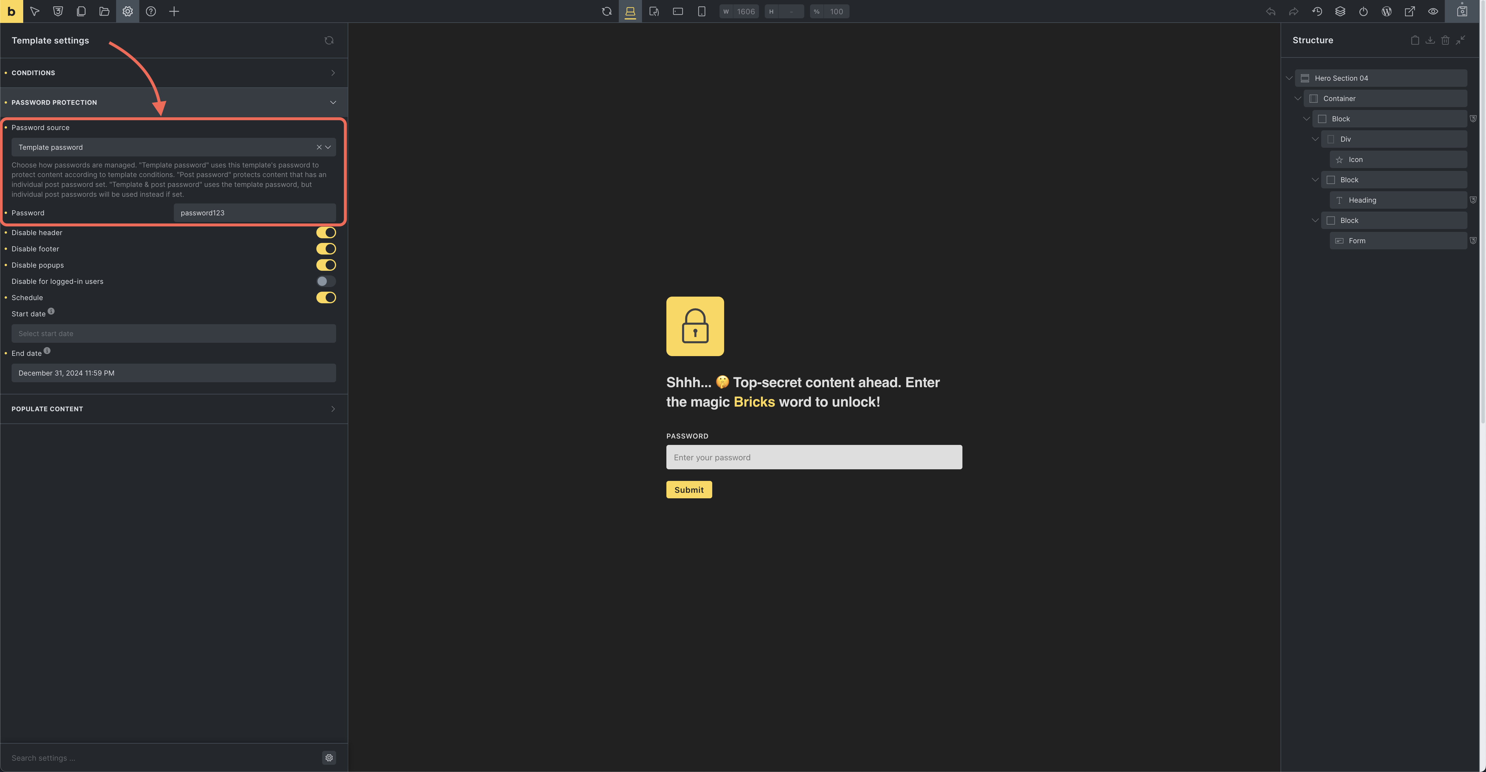 [bricks/password_protection/is_active](https://academy.bricksbuilder.io/filter-bricks-password_protection-is_active)filter to customize when the template should be active or bypassed.