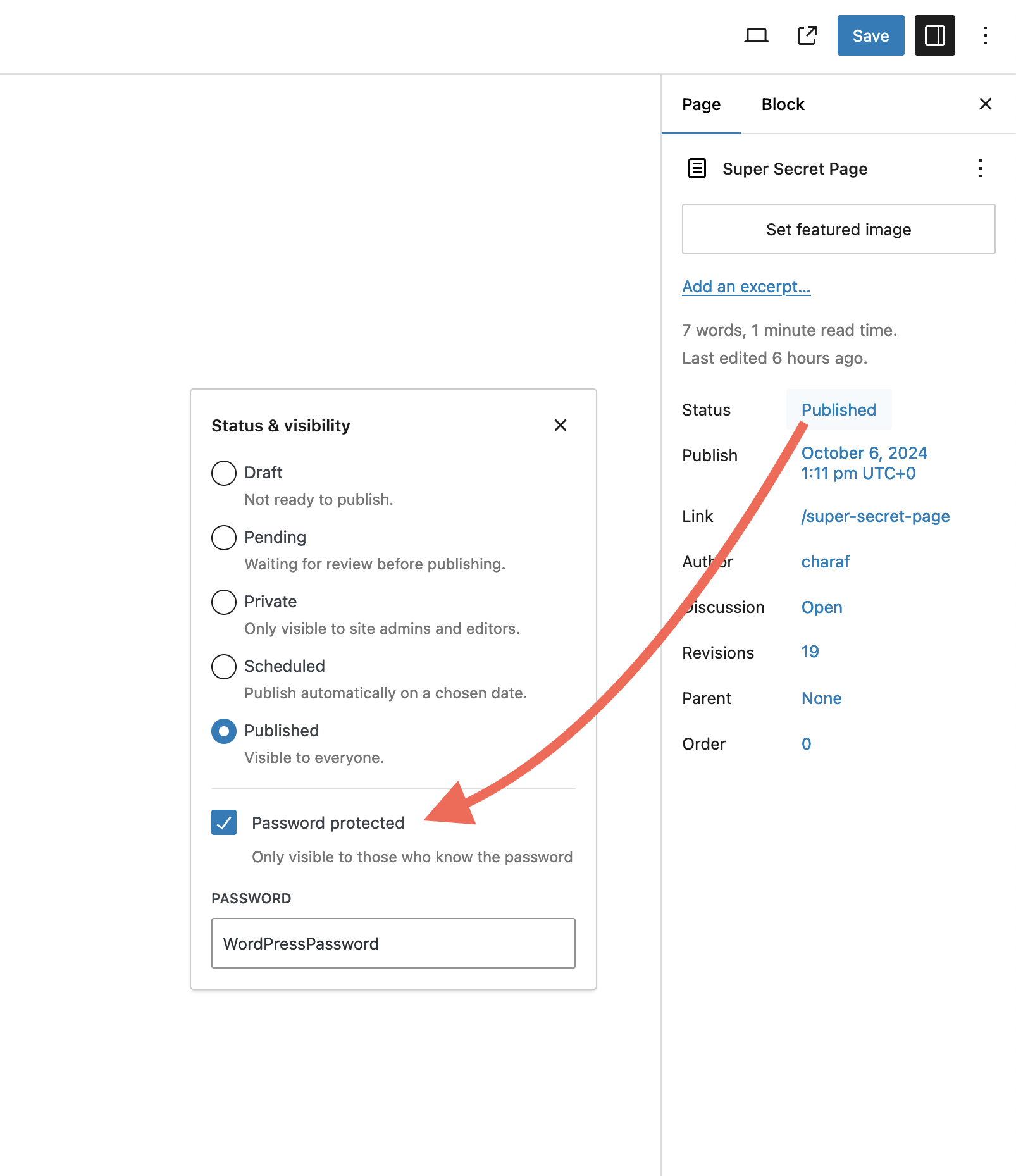 To protect content using the Post password method: