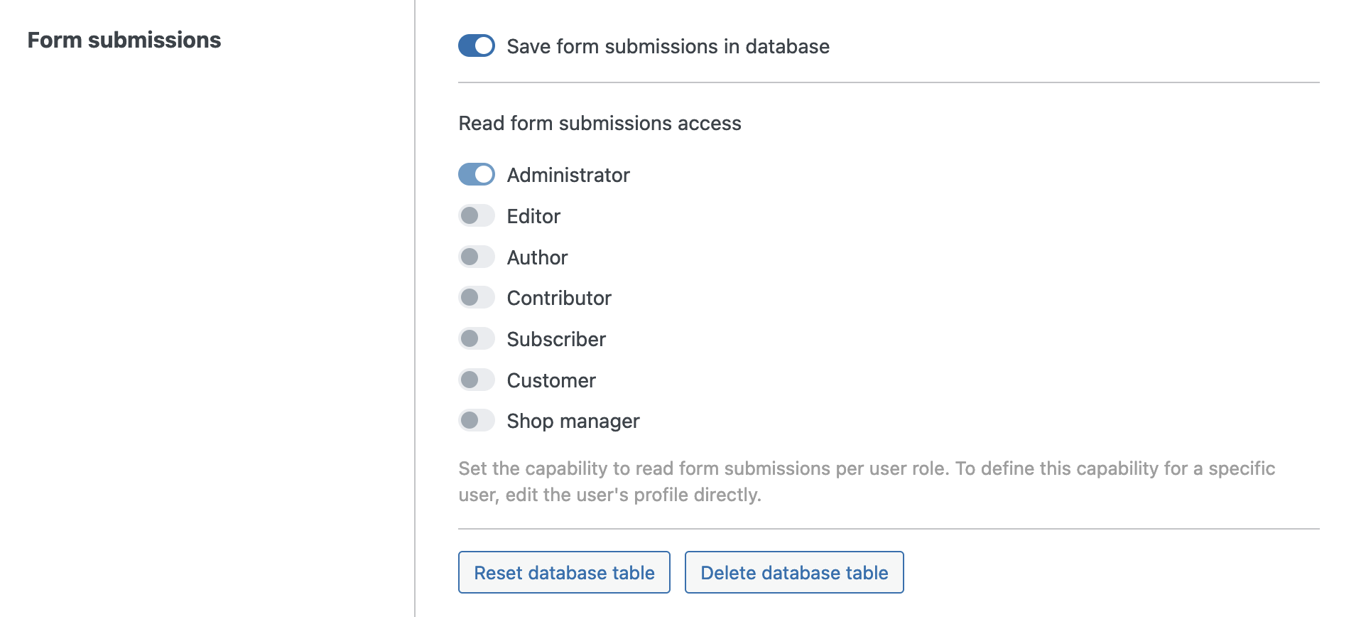 It’s important to exercise caution when using these buttons, as it permanently clears or deletes the form submissions database table. Make sure you have a backup of your data before proceeding.