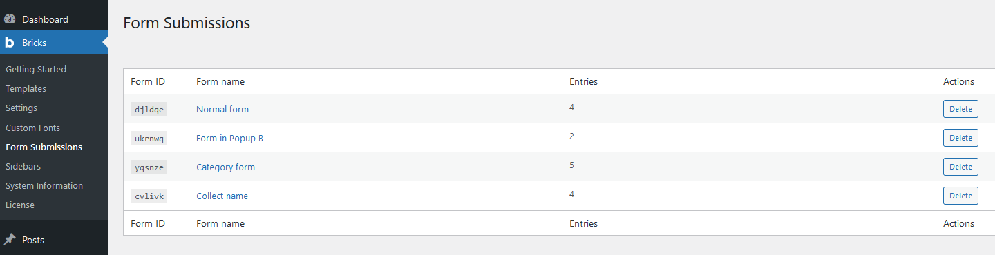 Section titled “Viewing form submissions”To view all collected form submissions, navigate to Bricks > Form submissions in your WordPress dashboard.