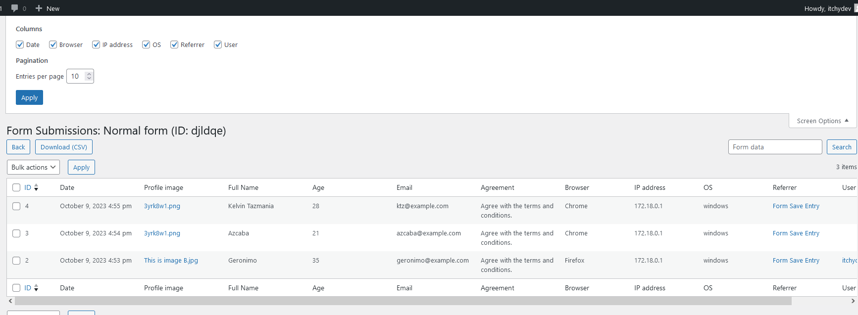 A click on “Screen options” in the top-right corner lets you toggle the form submission columns. The available columns include metadata such as Date, Browser, IP address, OS (Operating System), Referrer, and User (if logged in during form submission).