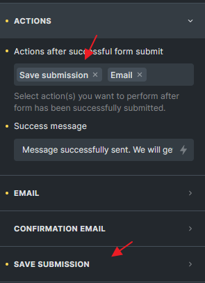 In our example, this means if the “Save submission” action fails, the “Email” action that follows it won’t be triggered.