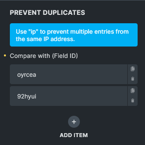 Section titled “Prevent duplicates”You can prevent storing duplicate form submissions if an entry with this particular data already exists.