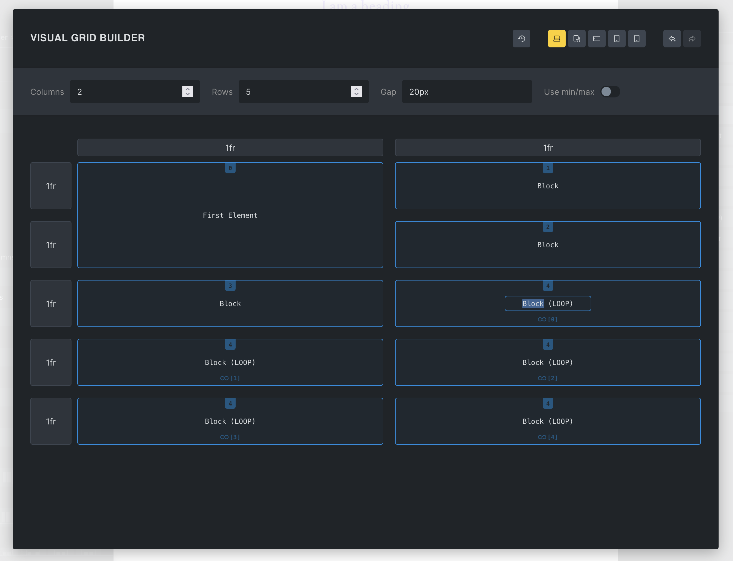 The new Visual Grid Builder allows you to visually design and manage your grid layouts. The feature becomes is available for any element with the display control set to grid, and allows you to: