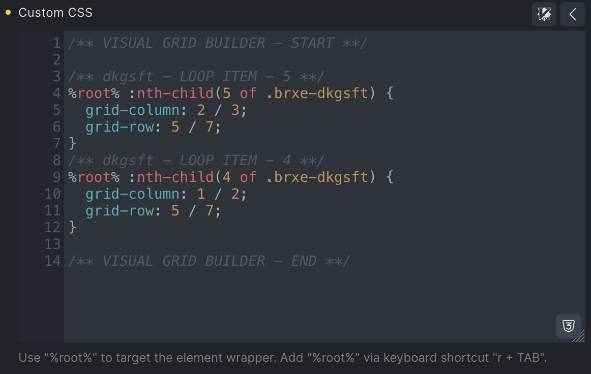Important: It is crucial not to alter the auto-generated CSS styles, as they are essential for maintaining the layout’s integrity. These styles are clearly marked with code comments, making them easy to identify and preserve. After moving or resizing an element, the CSS will automatically update to reflect the new values. If you choose to reset an element, the auto-generated custom CSS will be cleared, reverting the element to its original state.