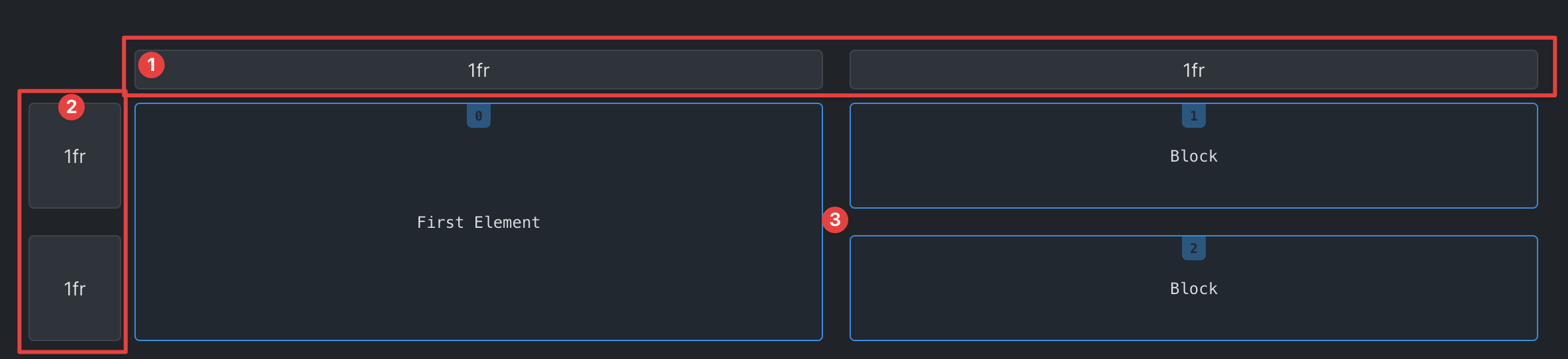 Sizes aure automatically calculated from your main element settings. For instance, repeat(3, 2fr) is converted to 2fr 2fr 2fr. You can also customize sizes using values like 1fr, 300px, or minmax(0, 1fr) or any other valid value, to adjust the design to your needs.