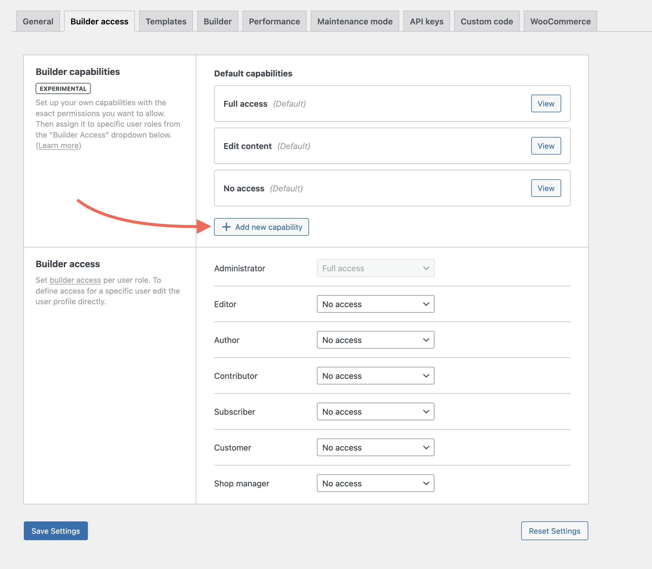 Section titled “Creating a custom capability”If you need precise control over the actions a user or role should be able to perform, you can create your very own custom builder capability, following the steps outlines below.