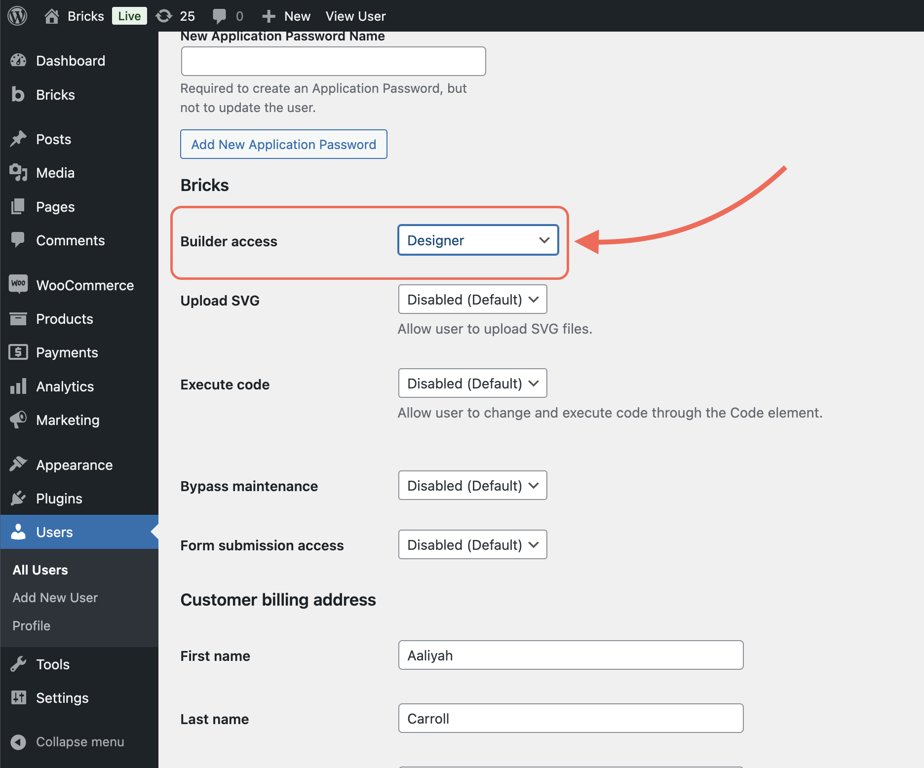 Full access: Grants access to all features and permissions in the Bricks builder.
