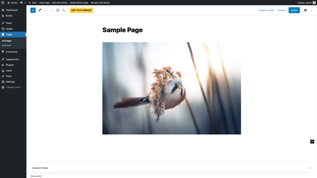 You can also enter the builder right after creating a new Page or while editing an existing Page by clicking the Edit with Bricks button at the top of the page: