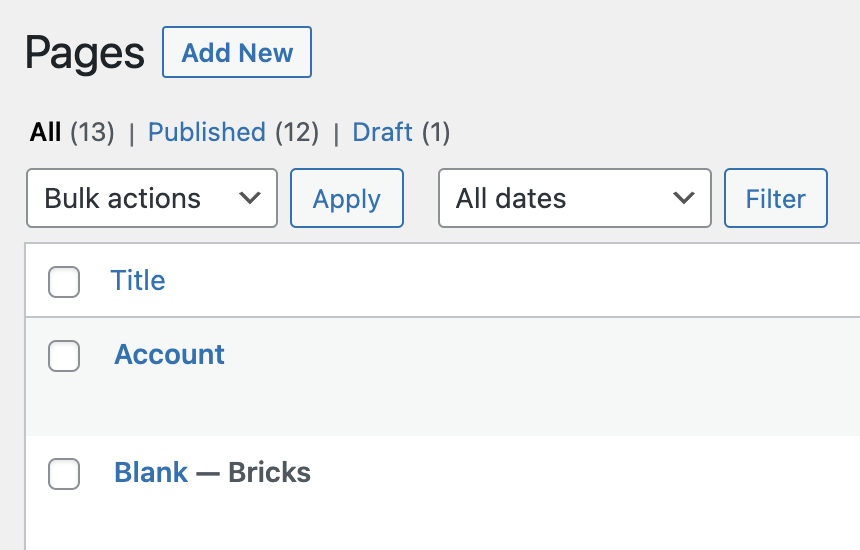 If a Page (or any other Bricks-enabled post type) is rendered with Bricks, you’ll see a ”- Bricks” post status after the title. In the screenshot below, you can see that the Account Page is not rendered with Bricks, but WordPress, and that the Blank Page is rendered with Bricks: