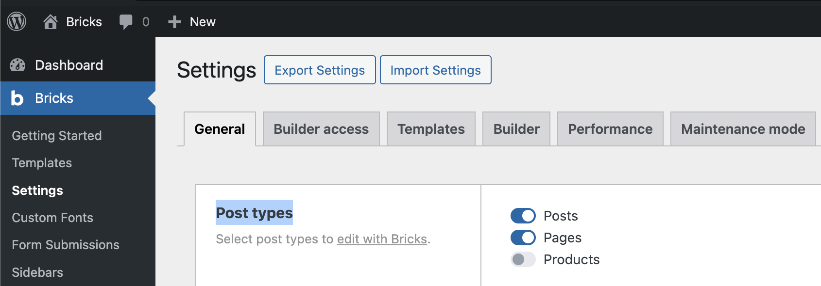 Once you have activated your license head over to Bricks → Settings and select the post types you want to edit with Bricks: